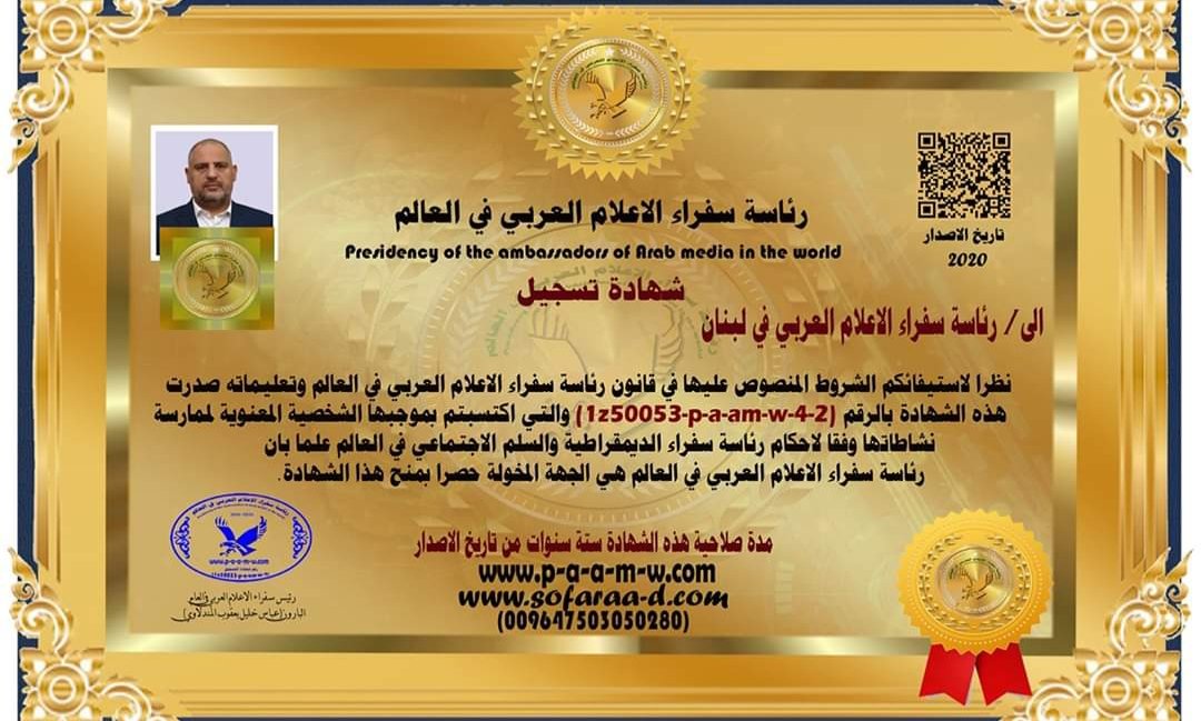 رئاسة سفراء الاعلام العربي في العالم هي الجهة المخولة حصرا بمنح هذا الشهادة.
